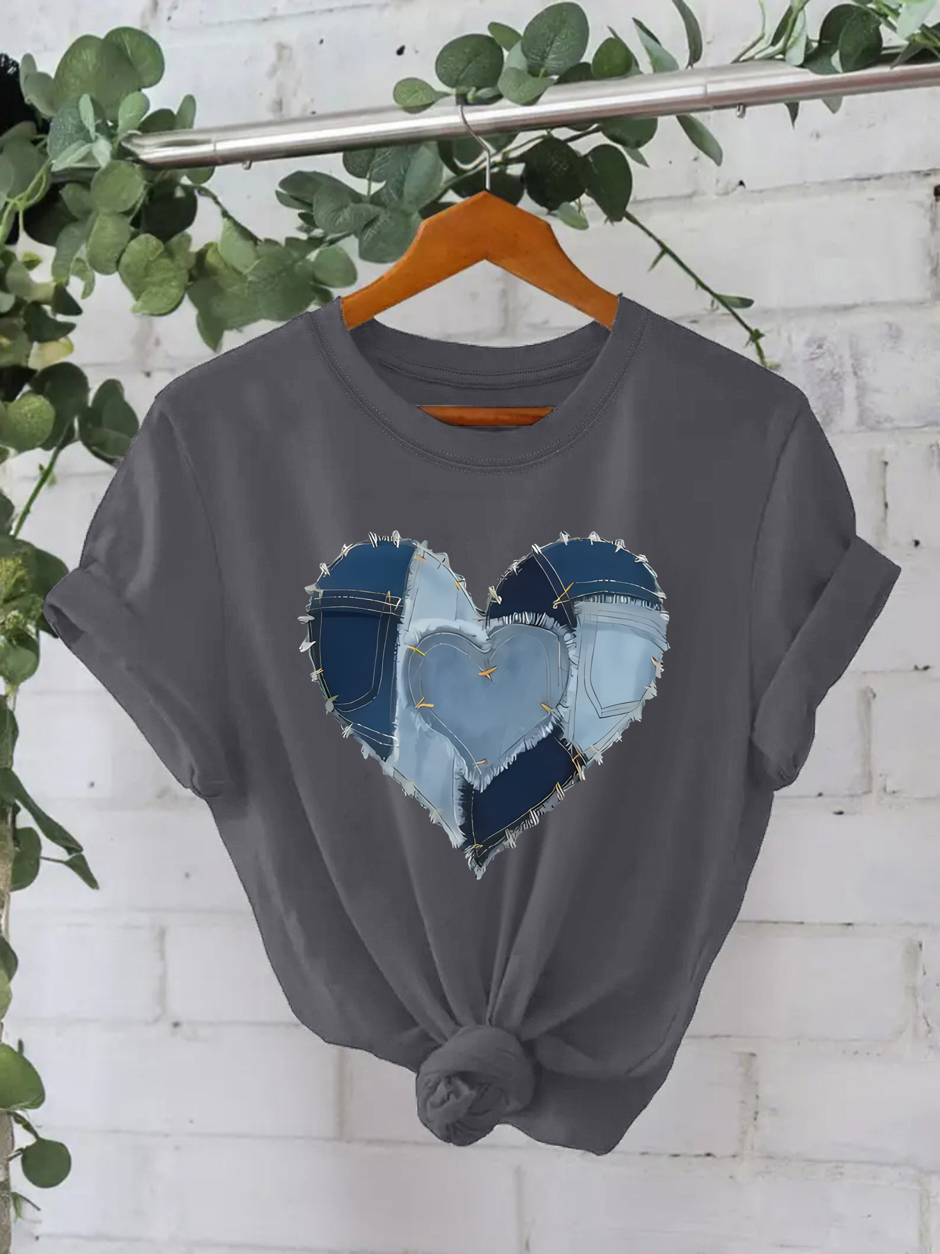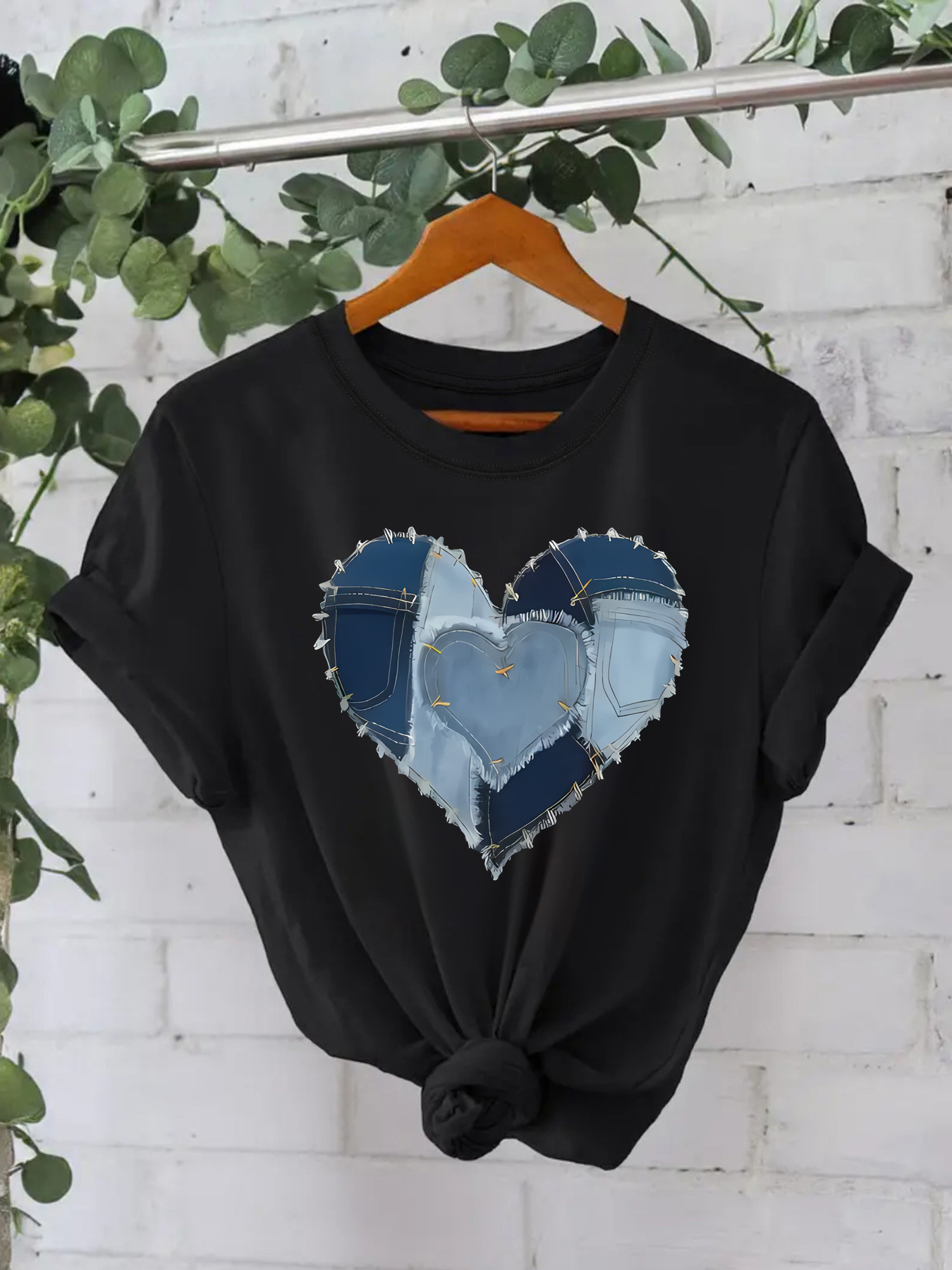 Western Cowboy Heart Graphic T-Shirt - Blue Denim Patch Print Short Sleeve Tee