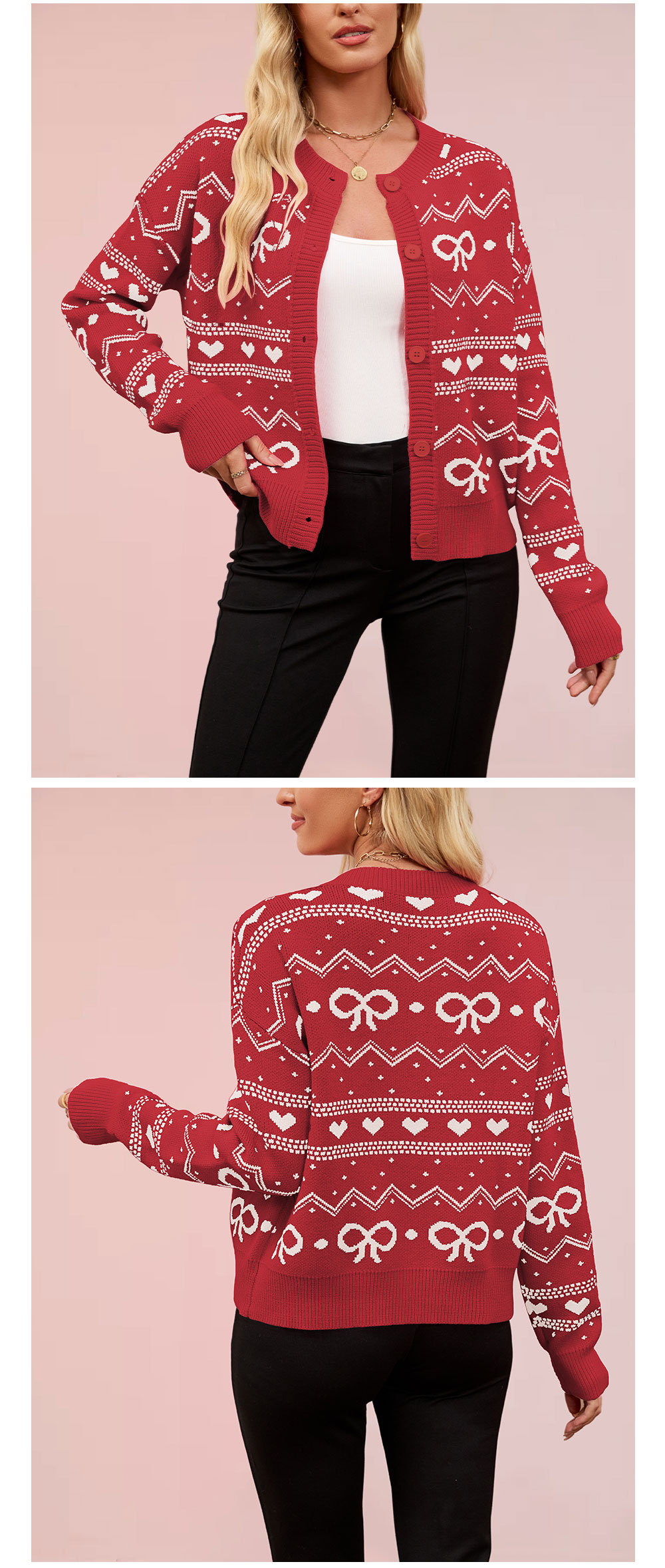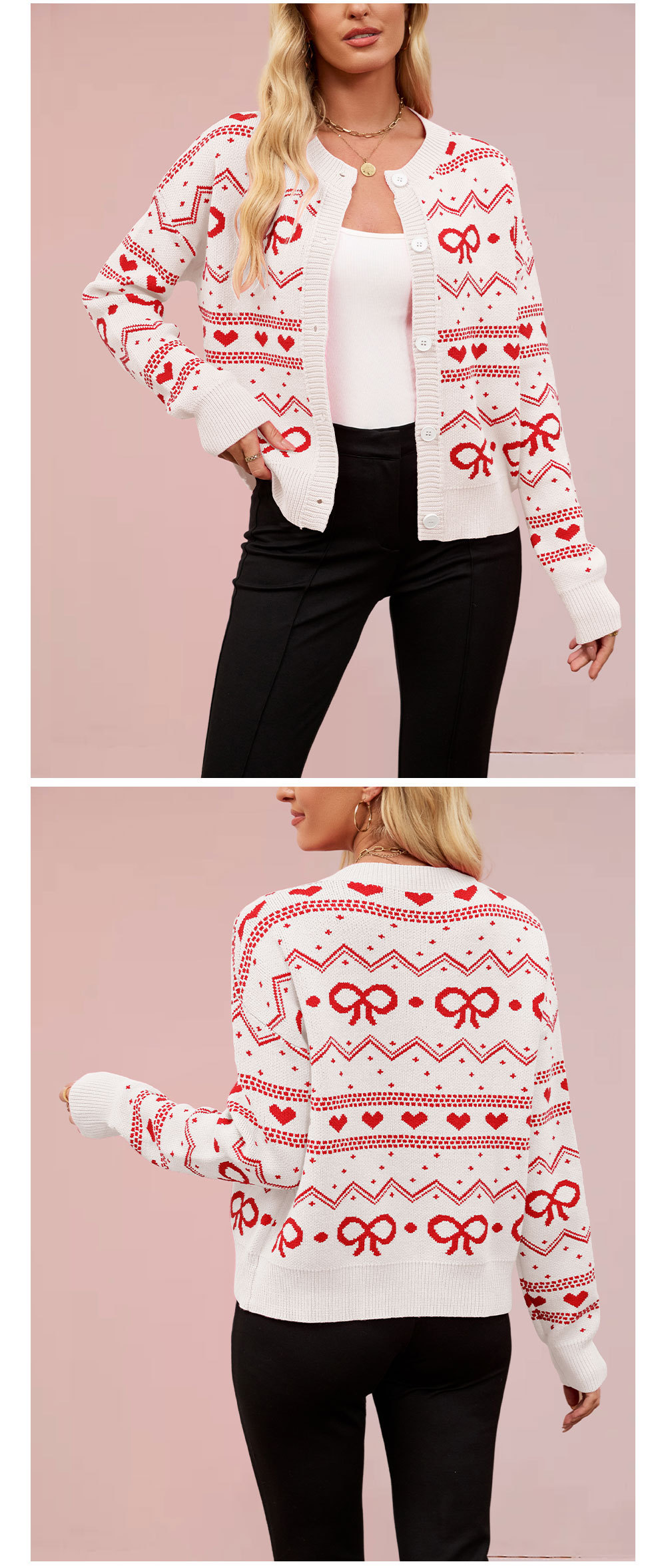 Women’s Valentine's Day Heart Pattern Cardigan – V-Neck Long Sleeve Knitted Sweater Jacket